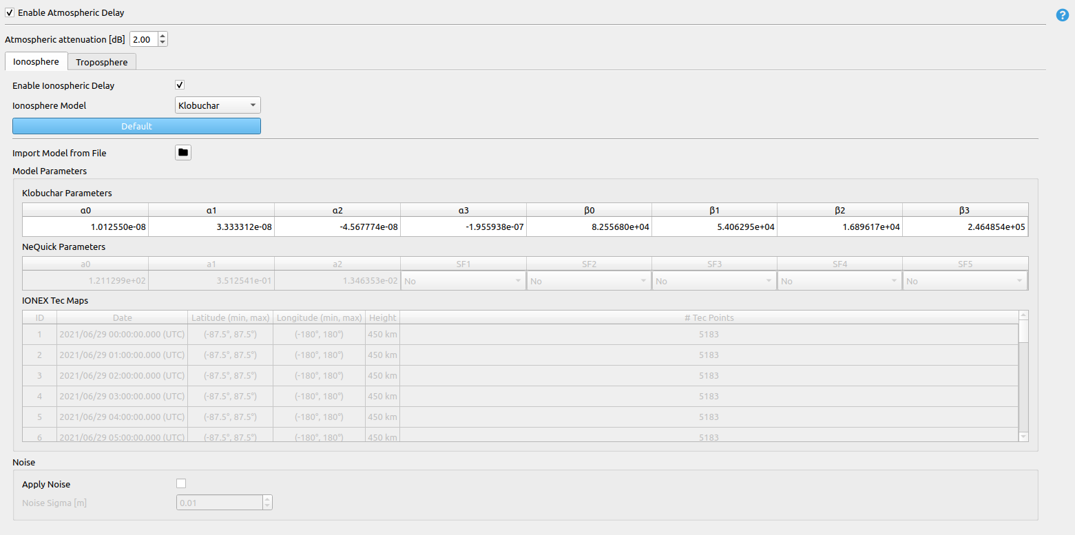 | Apply Noise | Determines, whether AWGN is applied to ionosphere-based delays. |
