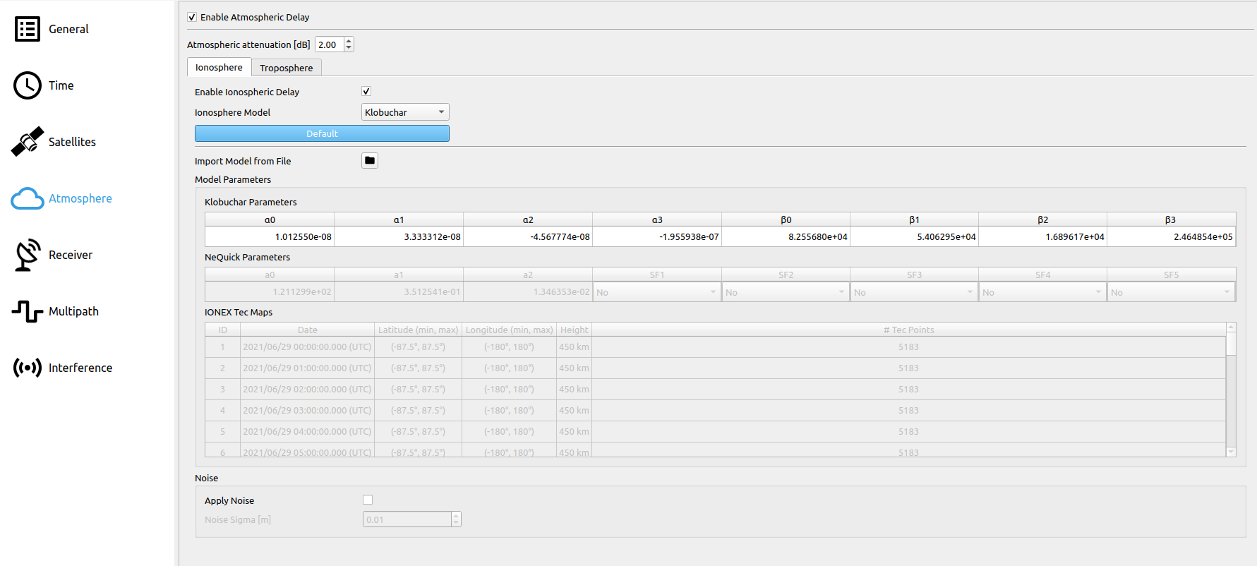 | NeQuick | NeQuick parameters are automatically converted to Klobuchar and vice versa. NOTE: IONEX TEC maps are not changed, when Klobuchar or NeQuick parameters are changed. |