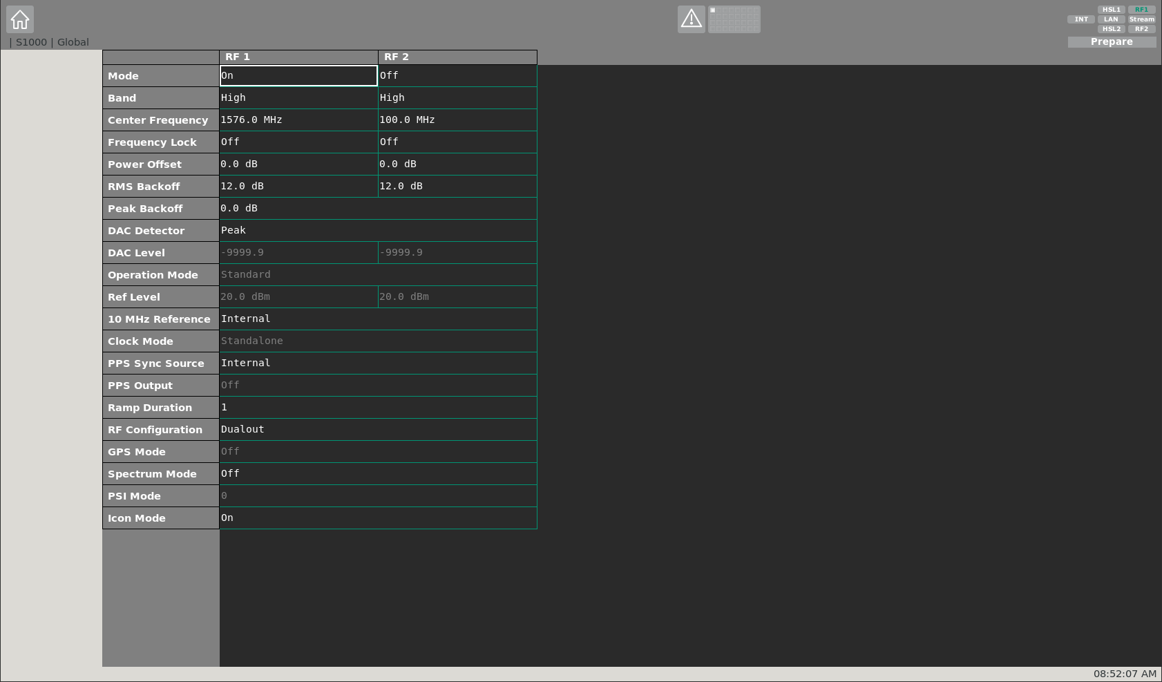 On the global settings sub-page, settings for both physical RF outputs can be adjusted. The most relevant ones are the Mode and Center-Frequency. Via the mode, a certain RF output can be toggled on/off (this can also be done via the toolbar on the top right). Each RF output of the S1000 covers a bandwidth of 120 MHz. The rest of the settings can remain unchanged.