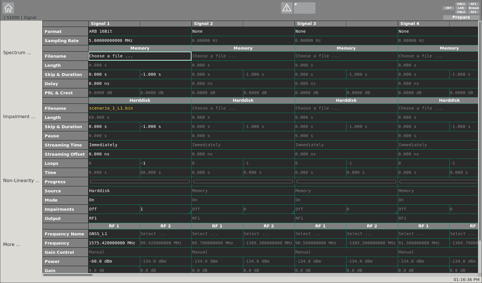After applying the global RF settings, the signal specific settings can be adapted. At this sub-page, i.a. the IF binary file can be selected, which will be up-converted to RF and streamed by the S1000. Up to 32 signals can be defined and de-/activated. An IF file can either be selected from memory or from a harddisk of the P1100.