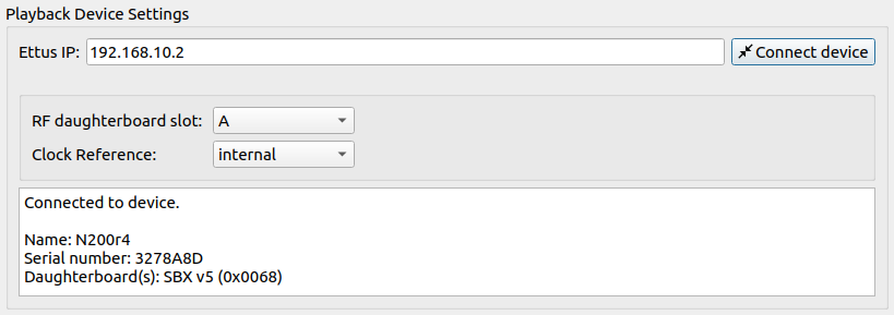- Connect the Ettus device: If the Ettus hardware is connected via ethernet to the host computer, set the Ettus IP address to 192.168.10.2 and click on the Connect device button. If successful, information of the device is shown to the user: