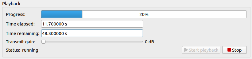 During streaming, the current progress and time information is displayed. Furthermore, it is possible to adapt the transmit gain via a slider. The signal streaming can be stopped at any time.
