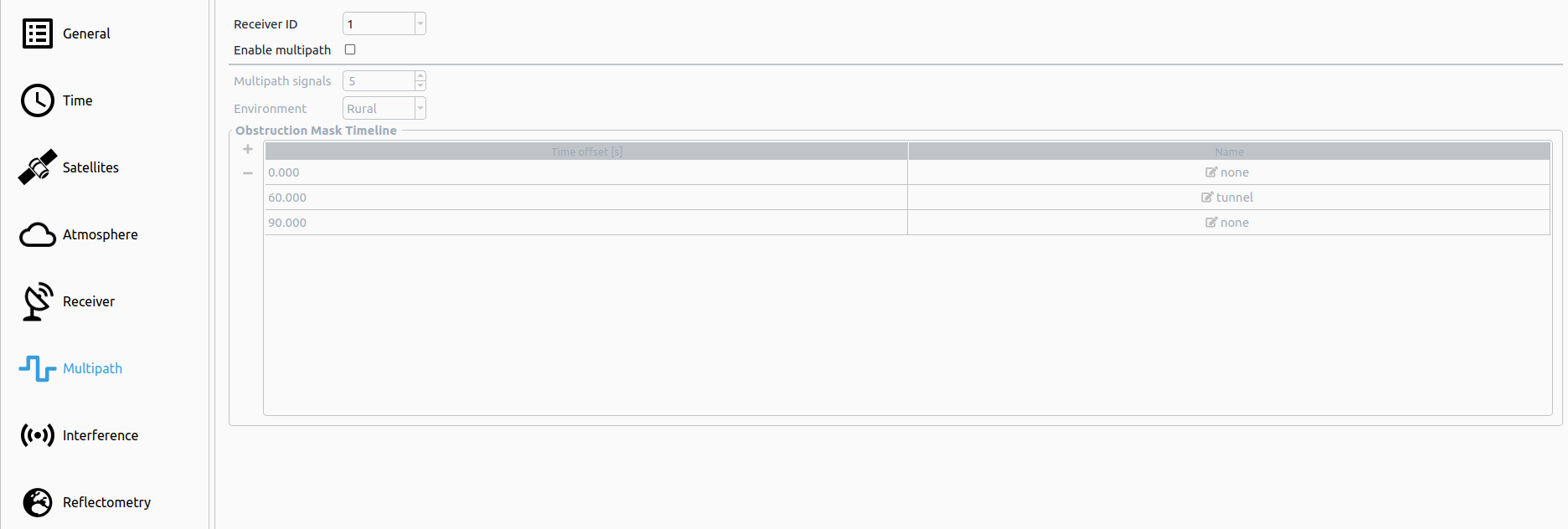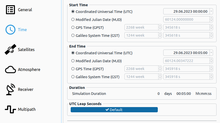 Go to the Atmosphere section. Atmospheric delay, ionospheric delay and tropospheric delay are enabled. The Klobuchar ionospheric model and the Hopfield tropospheric model are selected and the standard parameters are set. Do not change anything here to use the standard settings or simply click in the default button to use default atmospheric parameters.