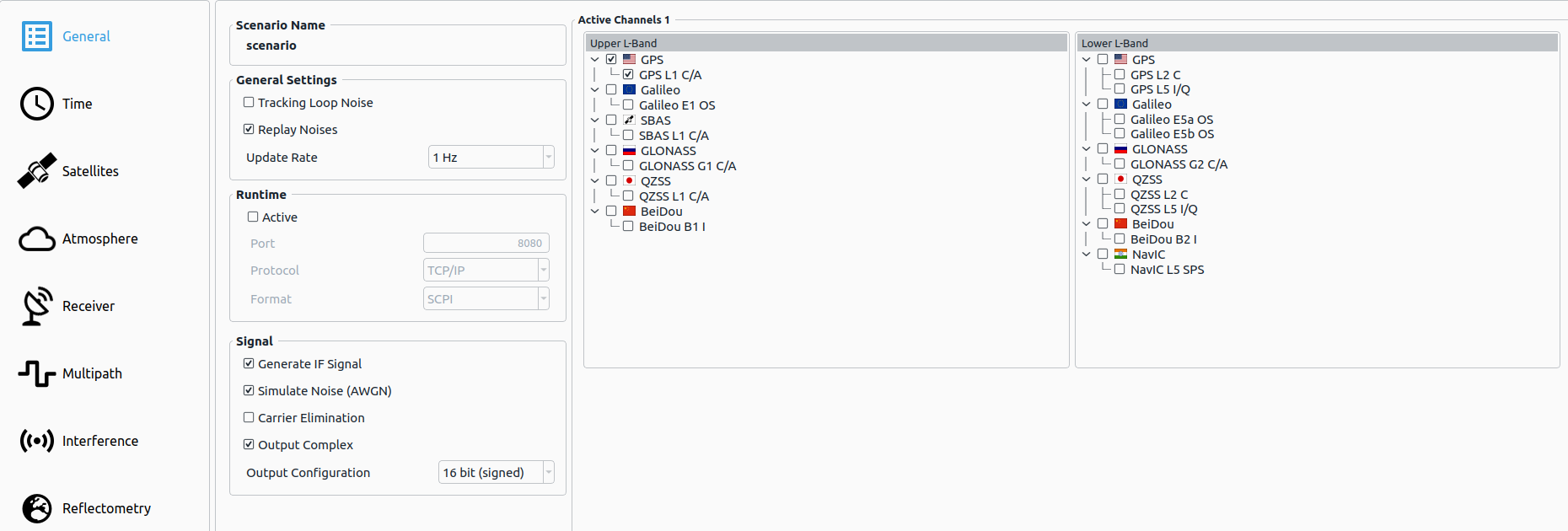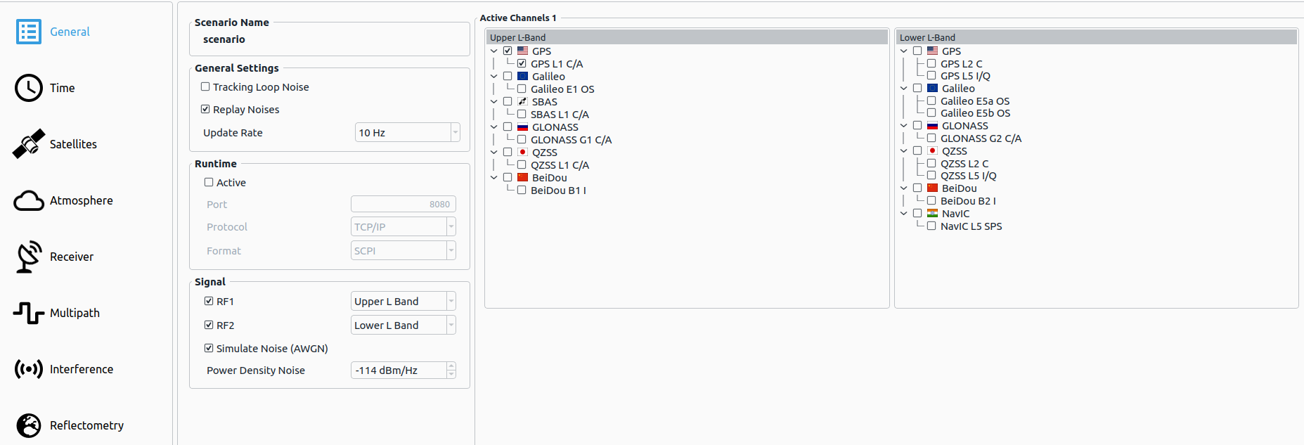 | Simulated Channels | Select GPS L1 C/A (coarse/acquisition) and Galileo E1 OS (I/NAV data + pilot) |