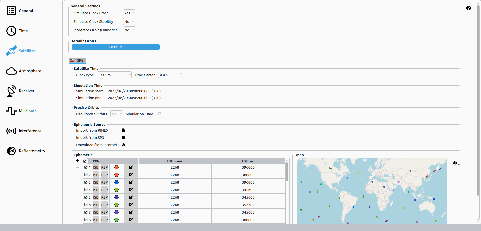 Go to the Satellites section. Ephemeris of satellites of both simulated systems (GPS and Galileo) are visible. Do not change anything here to use the ephemeris provided with the default scenario or simply click in the default button to use default constellation parameters.