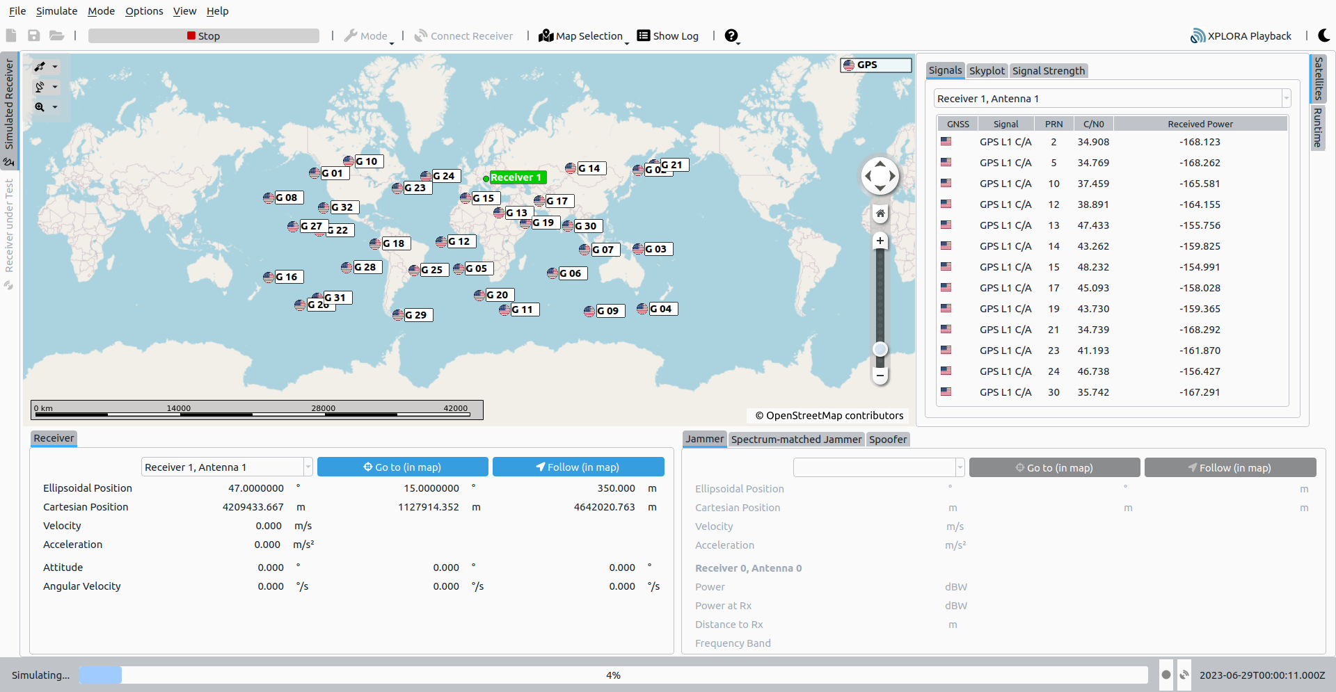 This section contains a tutorial for generating a simple XPLORA scenario for replaying. In the scenario GPS L1 C/A and Galileo OS (E1B and E1C) signals are simulated. The receiver trajectory is chosen from a KML-file.