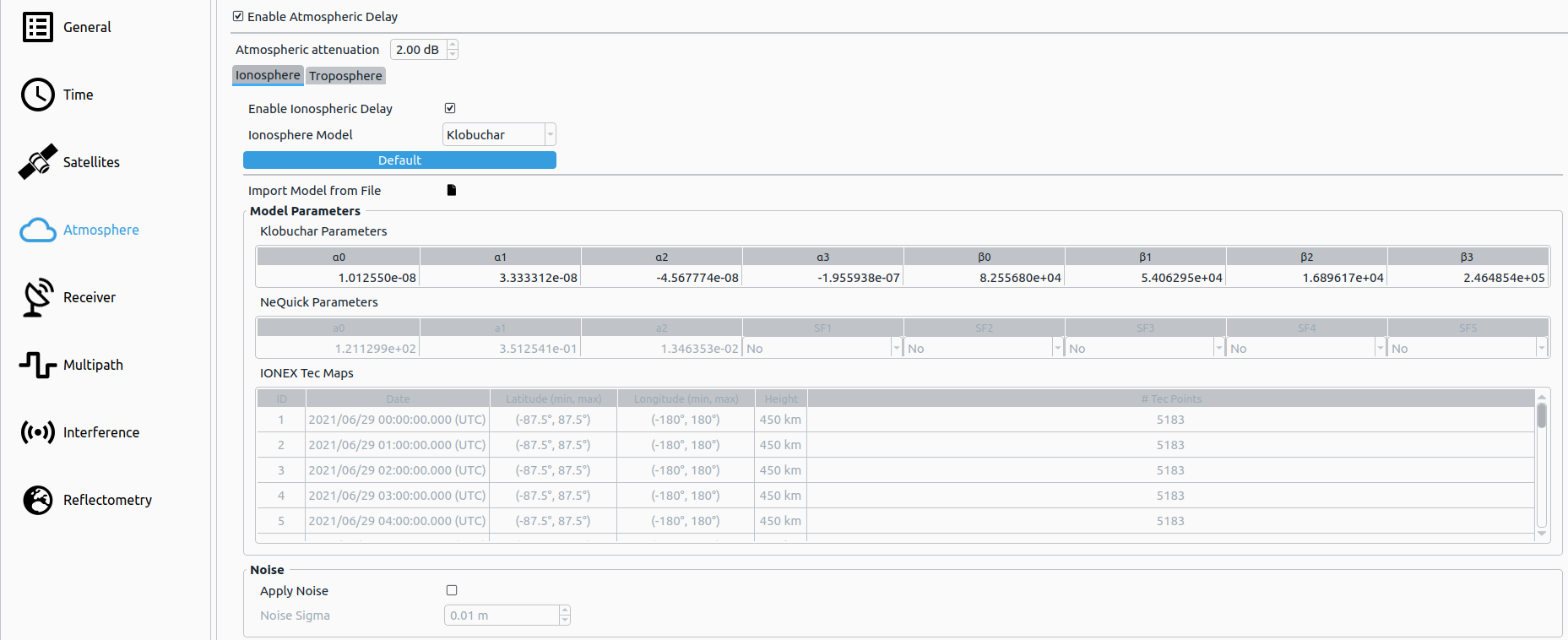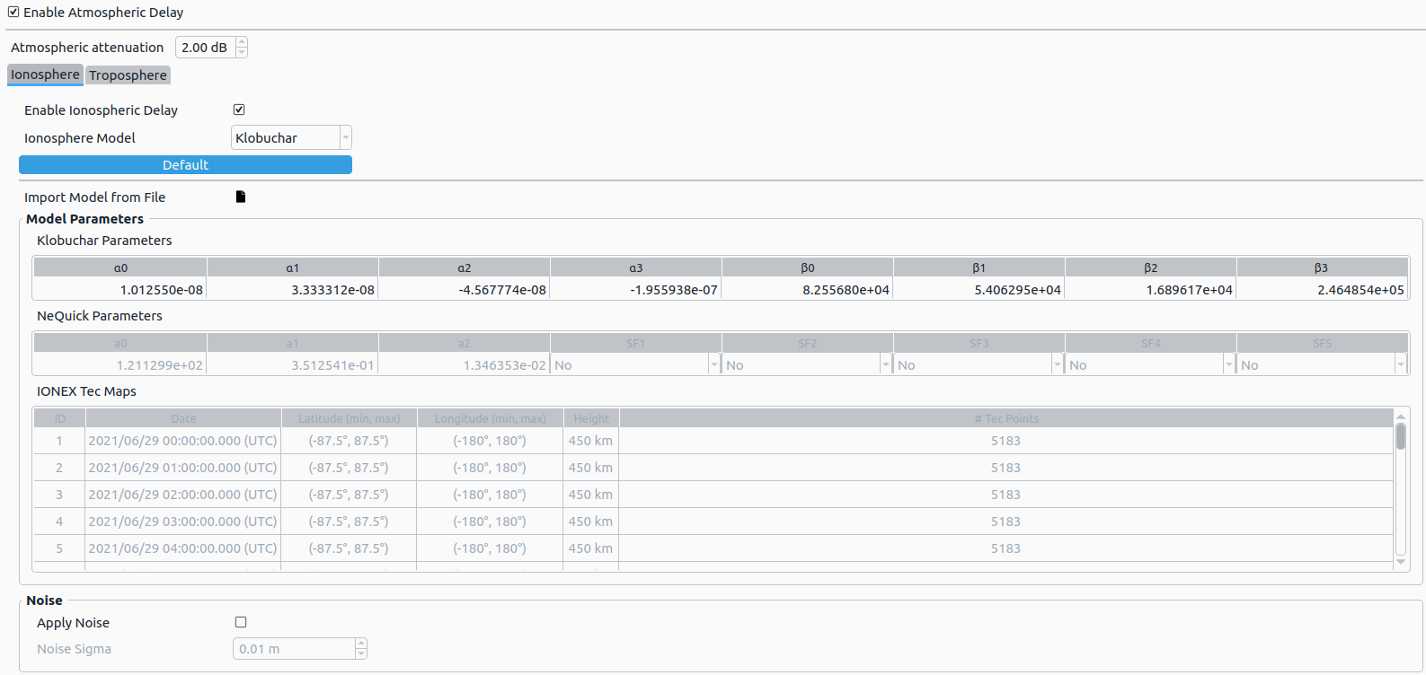 | NeQuick | NeQuick parameters are automatically converted to Klobuchar and vice versa. NOTE: IONEX TEC maps are not changed, when Klobuchar or NeQuick parameters are changed. |