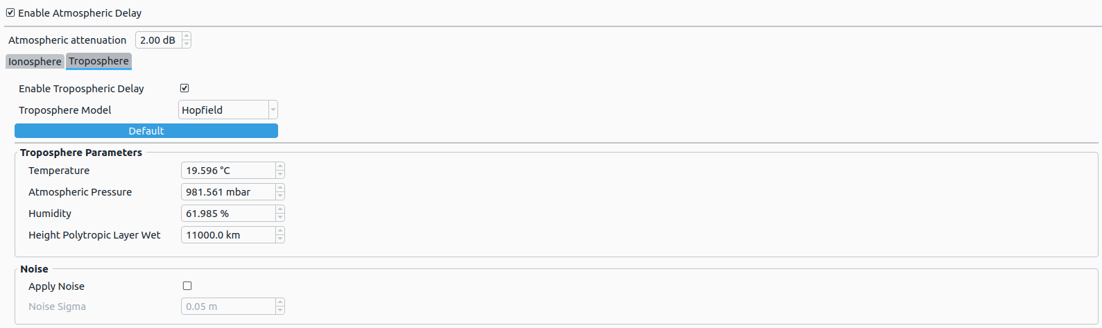 | Apply Noise | Determines, whether AWGN is applied to troposphere-based delays. |