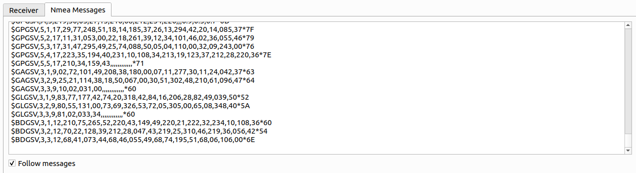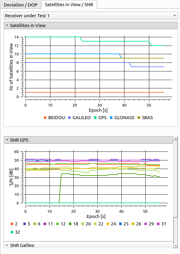 The Satellites in View plot shows the number of currently visible satellites for each GNSS system. For each GNSS system a SNR plot shows the signal to noise ratio of each visible satellite. Information for these plots are read from NMEA GSV messages.