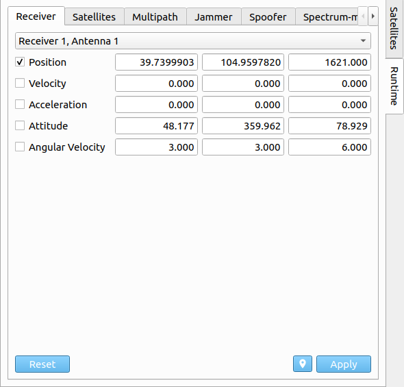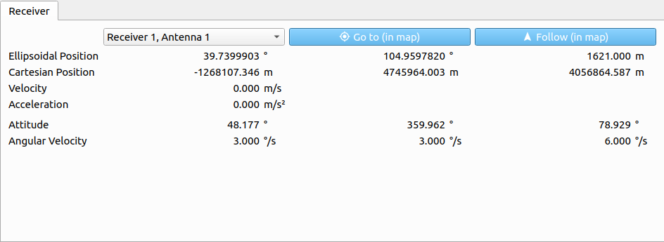 Within the Receiver tab, the current state (e.g. position, velocity, acceleration) and attitude (e.g. attitude and angular-velocity) of a selected receiver can be adapted. Via the