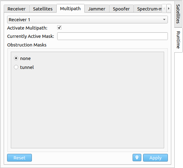 In the Multipath tab, multipath effects within the receiver can be activated or deactivated. Moreover, the currently active obstruction mask can be queried and changed. A new obstruction mask can be chosen from a list of predefined ones. More information on predefined obstruction masks can be found at Multipath. In order to apply any new settings/configurations, the checkbox on the left side needs to be enabled for each individual setting.