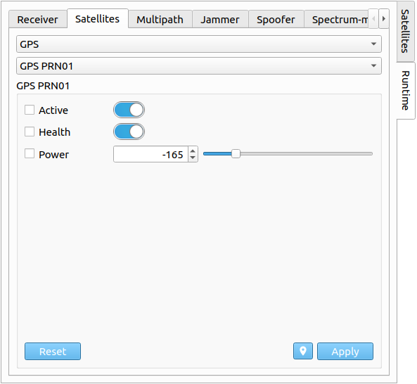 In the Satellites tab, individual satellites can be de-/activated, set un-/healthy and the transmitting signal power can be adapted as well. Each satellite of every GNSS system can be selected. The transmitting power can either be changed via a slider, or via a spinbox. In order to apply any new settings/configurations, the checkbox on the left side needs to be enabled for each individual setting.