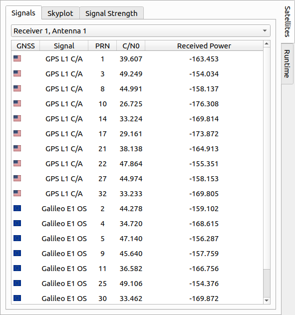 The signals tab lists information for all visible satellites of a receiver. Here, every active receiver can be selected for showing satellite signal information. The following parameters are displayed:
