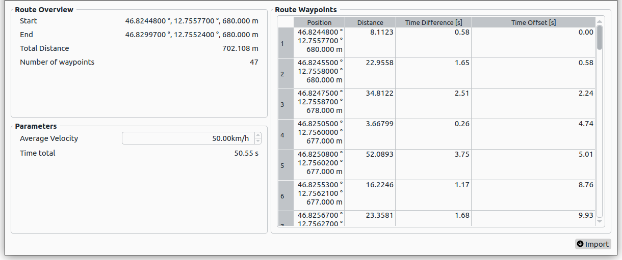 (c) One of two available routes were chosen.- The import route dialog is shown, which shows the start and end point of the route, the total distance covered, the number of waypoints and each waypoint in a table view. The user can select the average velocity with which the distance is covered.